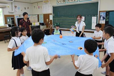 北小は銭太鼓「ちえっこよされ」、神代小はダンス「め組のひと」を発表し合い、混合チームでモルックの対戦を楽しみました。