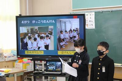 体験入学では、1年生が「たぬきの糸車」を音読し、2年生はスライドで小学校の紹介をしました。全員で「アイノカタチ」を合奏して、3人の新入生を出迎えました。