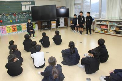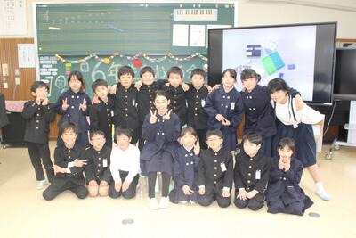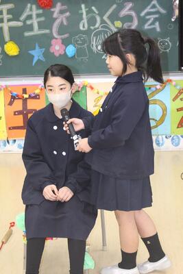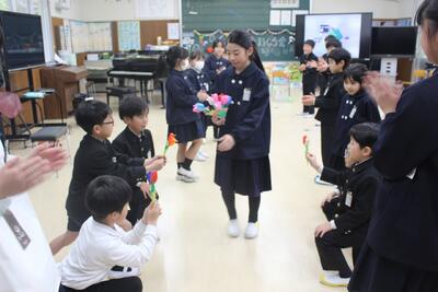 6年生を送る会 投稿: 管理者 (15:59) 感謝の気持ちを込めて 6年生を送る会では、ゲーム(思い出トーク・6年生○×クイズ)や出し物で楽しく卒業をお祝いしました。思い出トークでは、活発で小さい子の面倒見がよかった卒業生の姿が在校生の言葉からよく伝わってきました。5年生は6年生が示してくれた姿をしっかりと目に焼きつけて、次は自分たちが学校のリーダーになるんだ、という心構えで、新年度を迎えてほしいと思います。