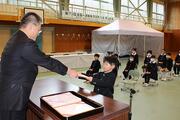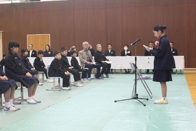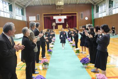 卒業式 投稿: 管理者 (16:15) ご卒業おめでとうございます 3月19日、卒業生1名が、自ら漉いた千年残る神代和紙の卒業証書を手に、在校生・保護者・教職員・地域の方々に送られて神代小学校を巣立っていきました。中学生になると、生活や学び方、人との関わりに多くの変化が訪れます。はじめのうちは戸惑うことがあるかもしれませんが、小学校で培ったことを糧にして、夢に向かって力強く前進し、大きく成長してほしいと思います。